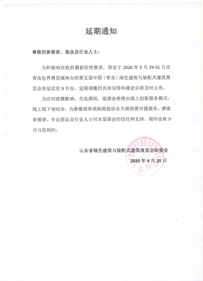 為積極響應(yīng)政府最新防控要求,原定于2020年5月29-31日在青島世界博覽城舉辦的第五屆中國(青島)綠色建筑與裝配式建筑展覽會(huì)將延遲至9月份,延期調(diào)整的具體安排待確定后將及時(shí)公布。