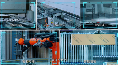 繼續(xù)前行,智能封邊、智能排孔、智能分揀、智能包裝……每一個(gè)環(huán)節(jié)都充滿(mǎn)了科技感與未來(lái)感。德國(guó)進(jìn)口的豪邁封邊設(shè)備,通過(guò)八道精密工序,為板材披上了一層“防潮、防蛀、美觀耐用”的鎧甲;智能排孔系統(tǒng)則根據(jù)板材二維碼信息精準(zhǔn)定位,確保五金連接件安裝無(wú)誤差;而全行業(yè)首條門(mén)板自動(dòng)分揀線(xiàn),更是以6軸智能機(jī)械臂的高效工作,精準(zhǔn)滿(mǎn)足了海量的個(gè)性化定制需求。最后,智能包裝機(jī)械手將板材整理得井井有條,結(jié)合最優(yōu)空間利用方式打包,確保運(yùn)輸過(guò)程中穩(wěn)固無(wú)損,為消費(fèi)者提供了一份完美的家居定制解決方案。
