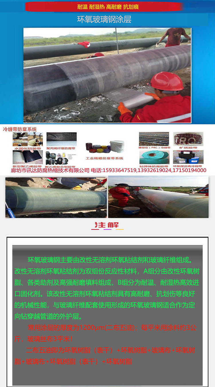 環(huán)氧玻璃鋼主要由改性無(wú)溶劑環(huán)氧粘結(jié)劑和玻璃纖維組成。改性無(wú)溶劑環(huán)氧粘結(jié)劑為雙組份反應(yīng)性材料,A組分由改性環(huán)氧樹(shù)脂、各類(lèi)助劑及高強(qiáng)耐磨填料組成,B組分為耐溫、耐濕熱**進(jìn)口固化劑。該改性無(wú)溶劑環(huán)氧粘結(jié)劑具有高耐磨、抗劃傷等良好的機(jī)械性能,yu玻璃纖維配套使用形成的環(huán)氧玻璃鋼適合作為定向鉆穿越管道的外護(hù)層。
