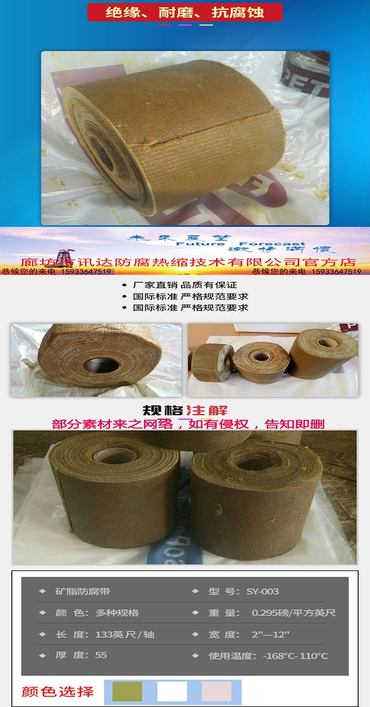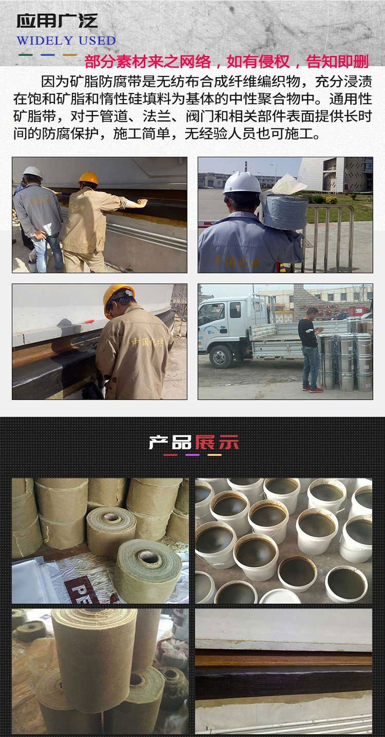4、膠帶具有優(yōu)異的可塑性和柔韌性,可以被捏成任何形狀,適用于任何規(guī)則和不規(guī)則形狀的工件表面的防腐。