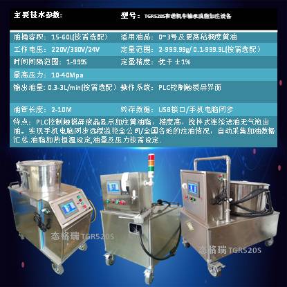 TGR520S集高壓油泵、注油智能控制、網(wǎng)絡(luò)數(shù)據(jù)處理等技術(shù)為一體的自動智能潤滑設(shè)備。有可視化操控,網(wǎng)絡(luò)數(shù)據(jù)傳輸,定時定量定點、動態(tài)線/面潤滑注脂,實時自動遠程監(jiān)控,全自動通訊,故障自檢及聲光報警等功能。一臺設(shè)備可替代多個崗位,讓傳統(tǒng)的潤滑作業(yè)更省油,省力,省時。即可加注0-3號普通黃油,也可加注粘性低的散油脂及粘性強的拉絲潤滑脂。TGR520S油量控制從0.01毫升起步的微量油脂定量加注機到幾升或幾十升的大流量快速注脂或分裝。