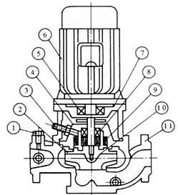 IHG型結構說明: 1.機械密封前置有承磨付,泵蓋上設有密封冷卻,沖洗孔,適用于抽送介質易揮發(fā)或晶的場合,延長在介質含微小顆粒時機械密封的使用壽命。 2.泵與電機軸承組合裝置,保證軸運轉精度,提高了密封的可靠性。 3.機械密封采用硬質合金材質。